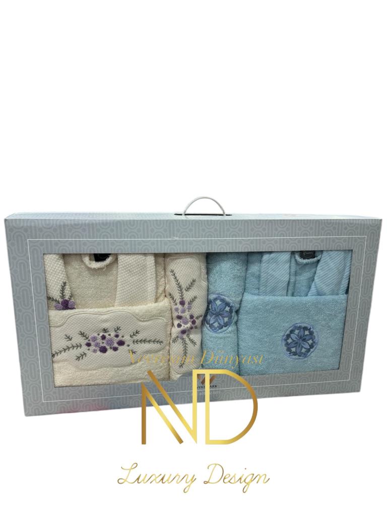 Nakışlı Bornoz Seti Açık Mavi Krem